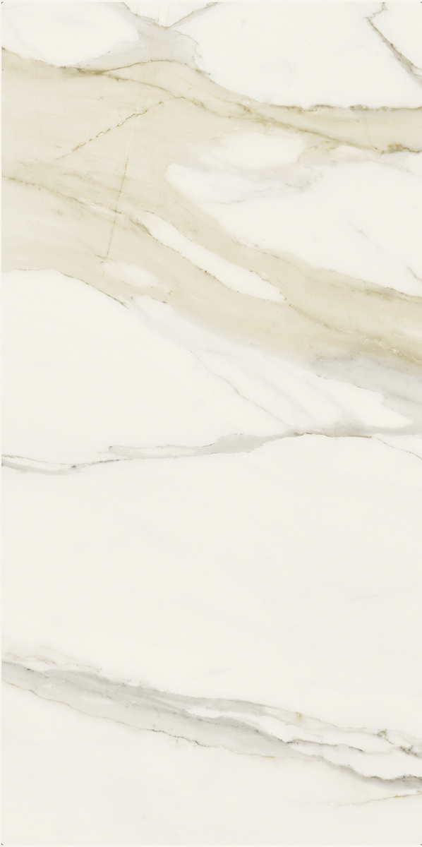 Ректифицированный. Матовая поверхность. Классический рисунок мрамора calacatta теплого белого цвета с серо-бежевыми венами. Толщина 6 мм. В комплекте с другими буквами (B,C,D,E.F) складывается в рисунок.