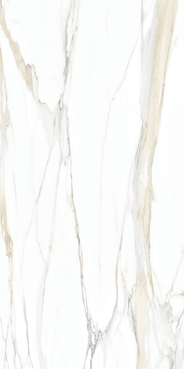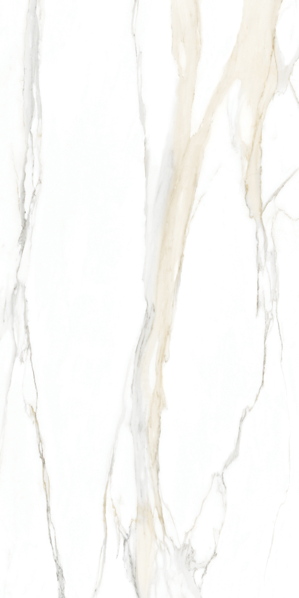 Ректифицированный. Полированная поверхность. Классический рисунок натурального мрамора Calacatta Gold теплого белого цвета с золотисто-серыми венами. Толщина 6 мм.