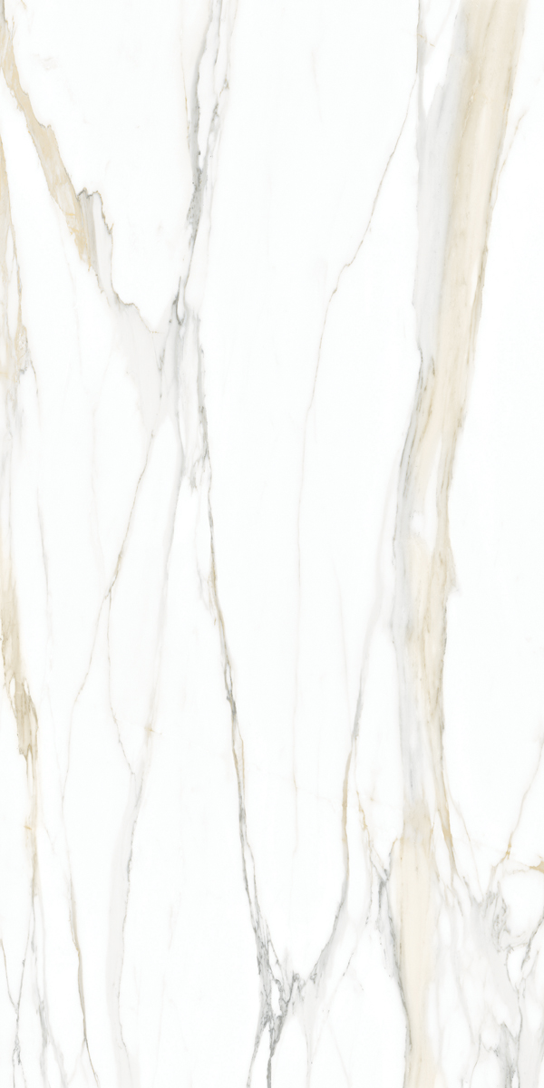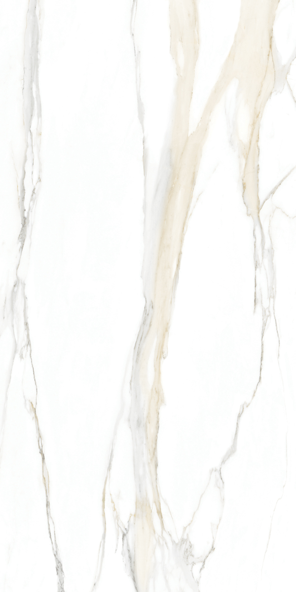 Ректифицированный. Матовая поверхность. Классический рисунок натурального мрамора Calacatta Gold теплого белого цвета с золотисто-серыми венами. Толщина 6 мм.