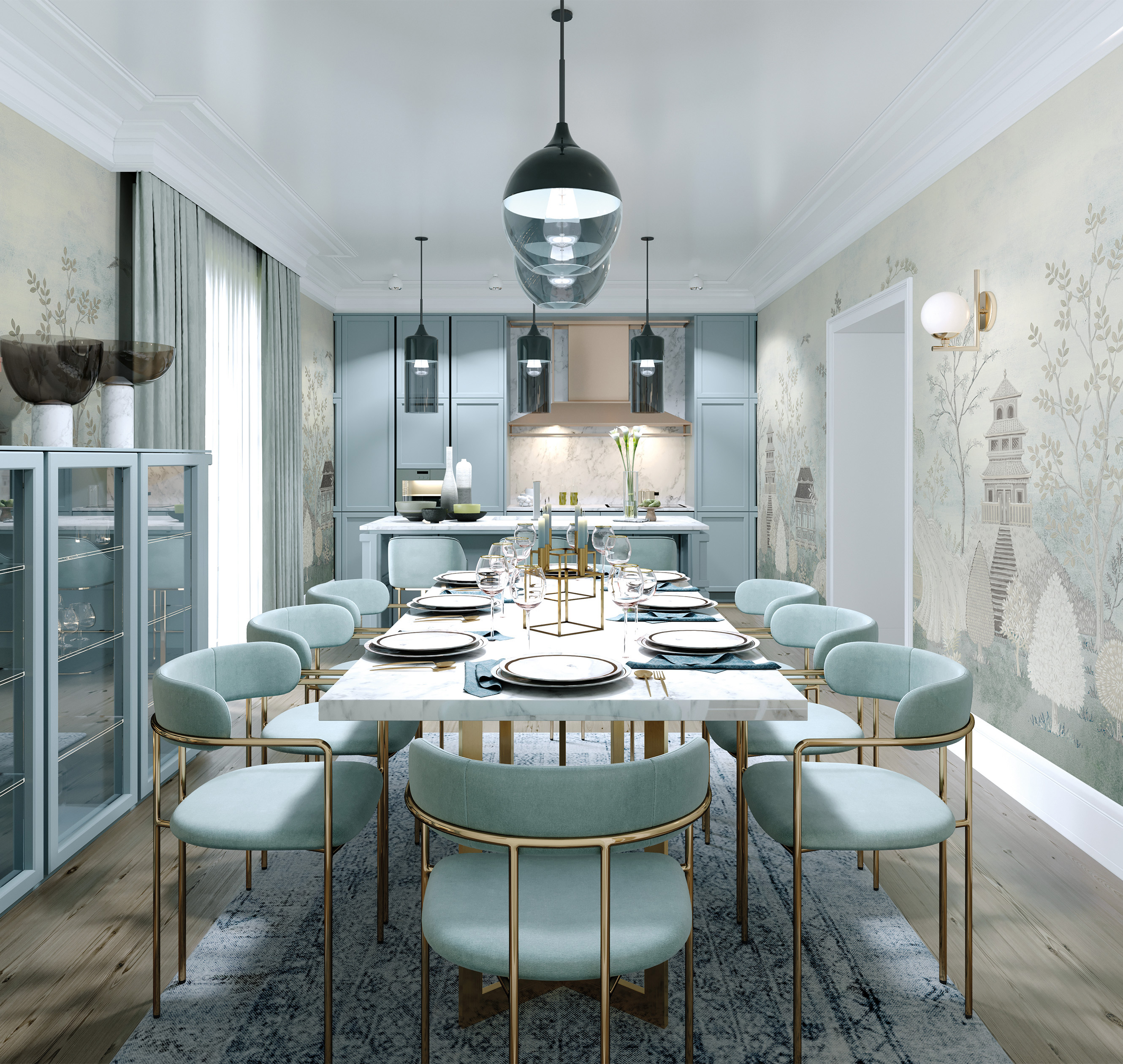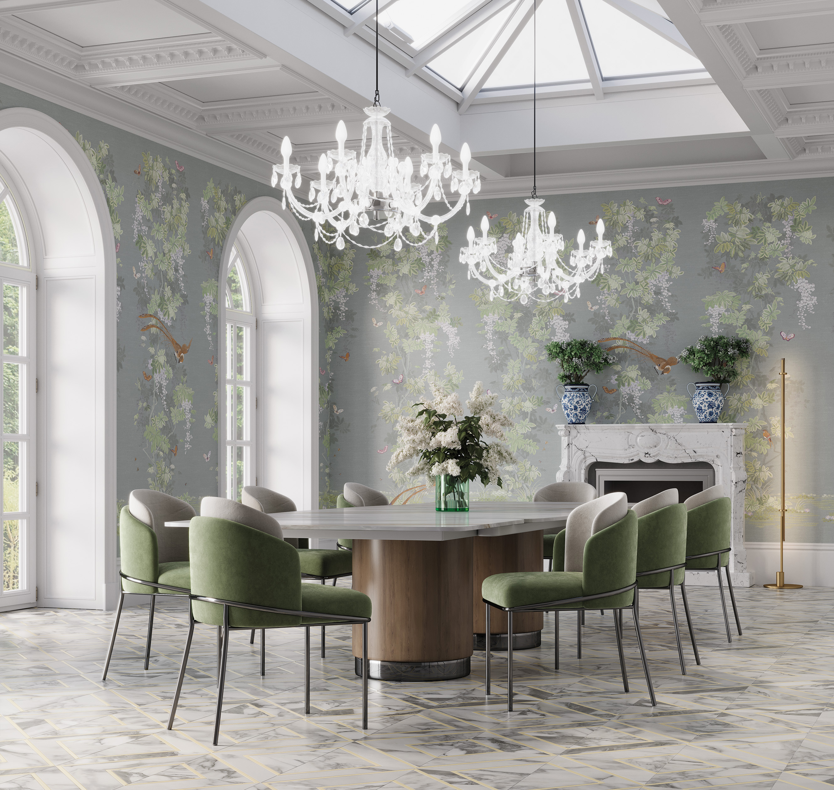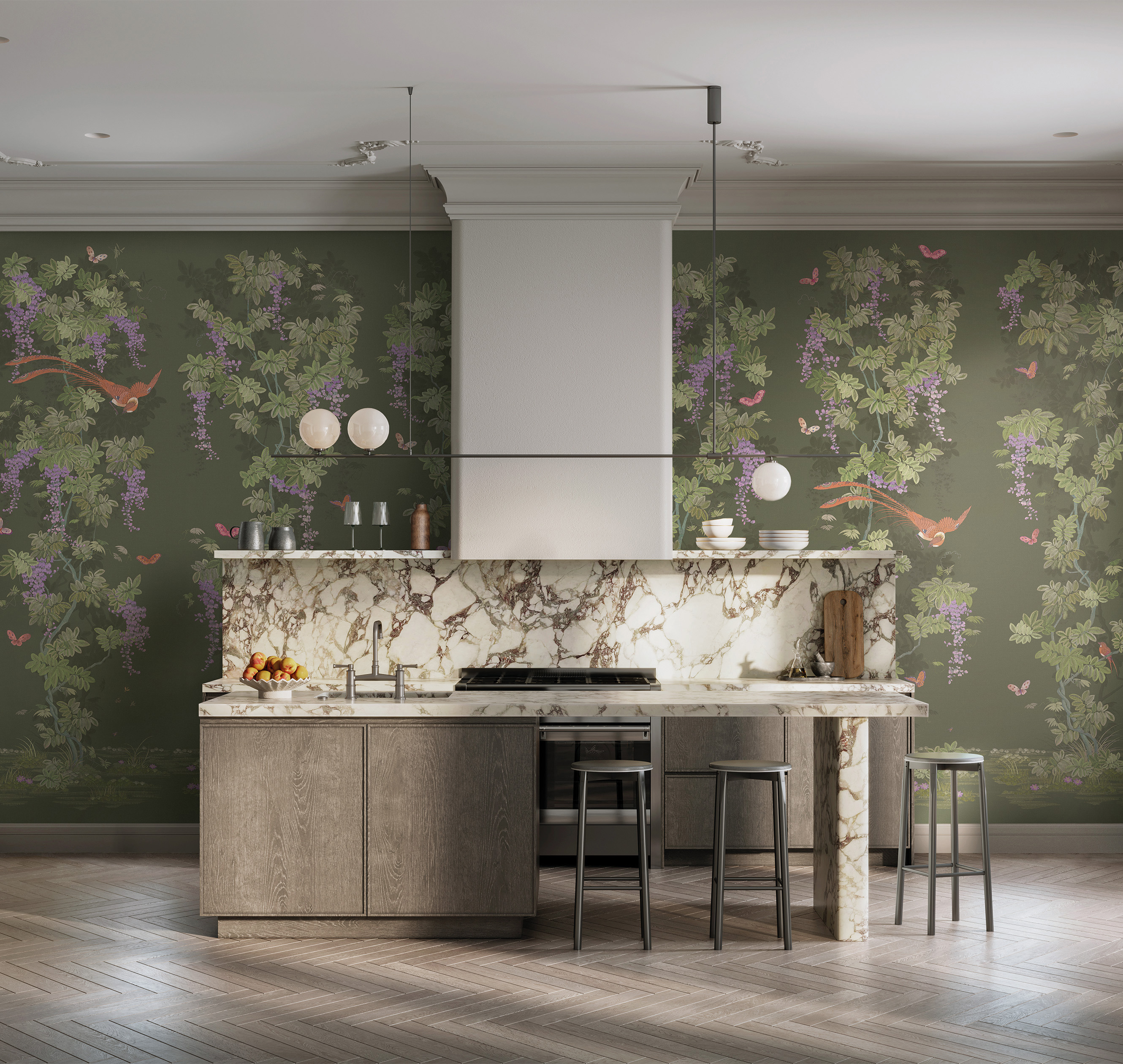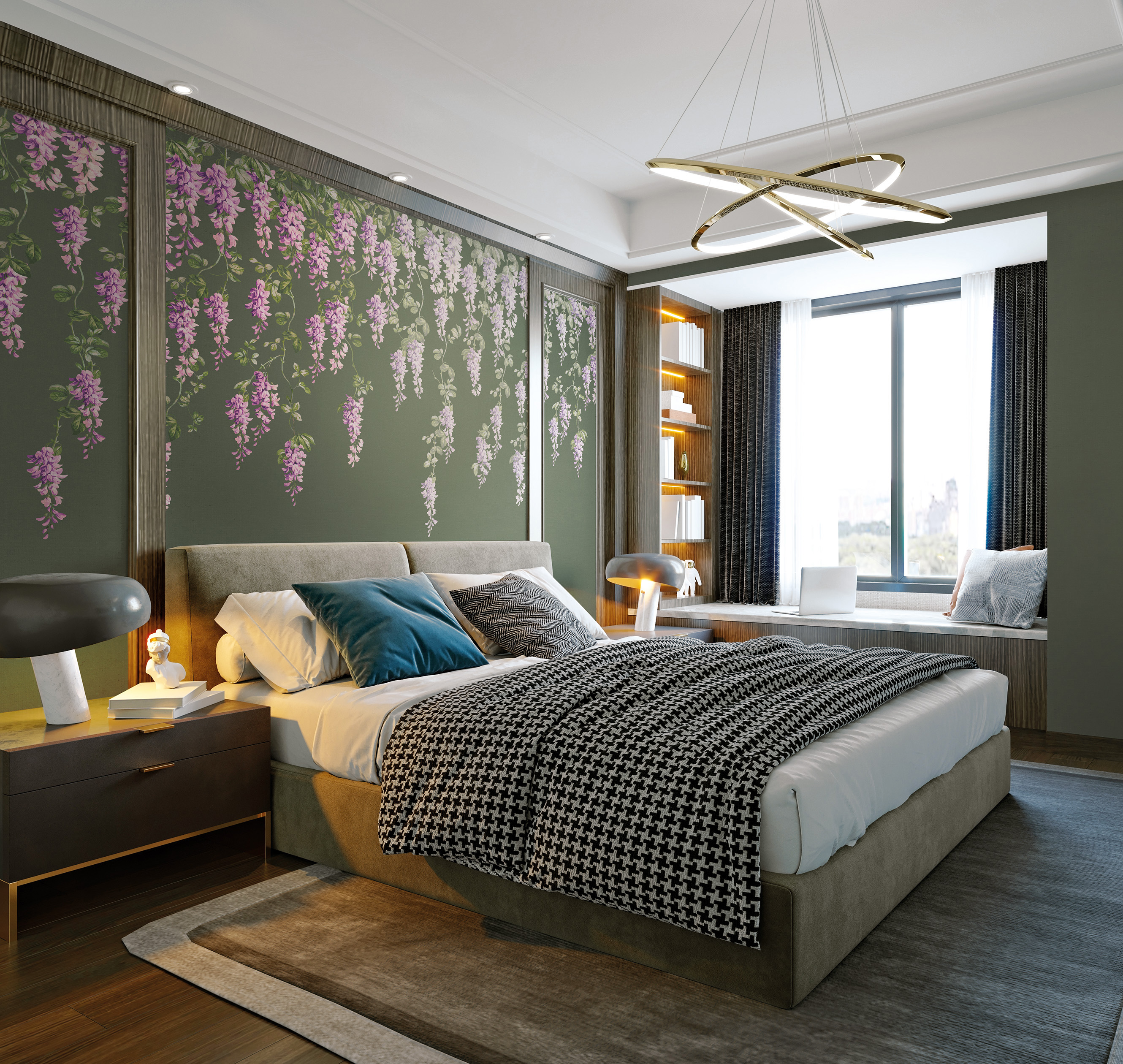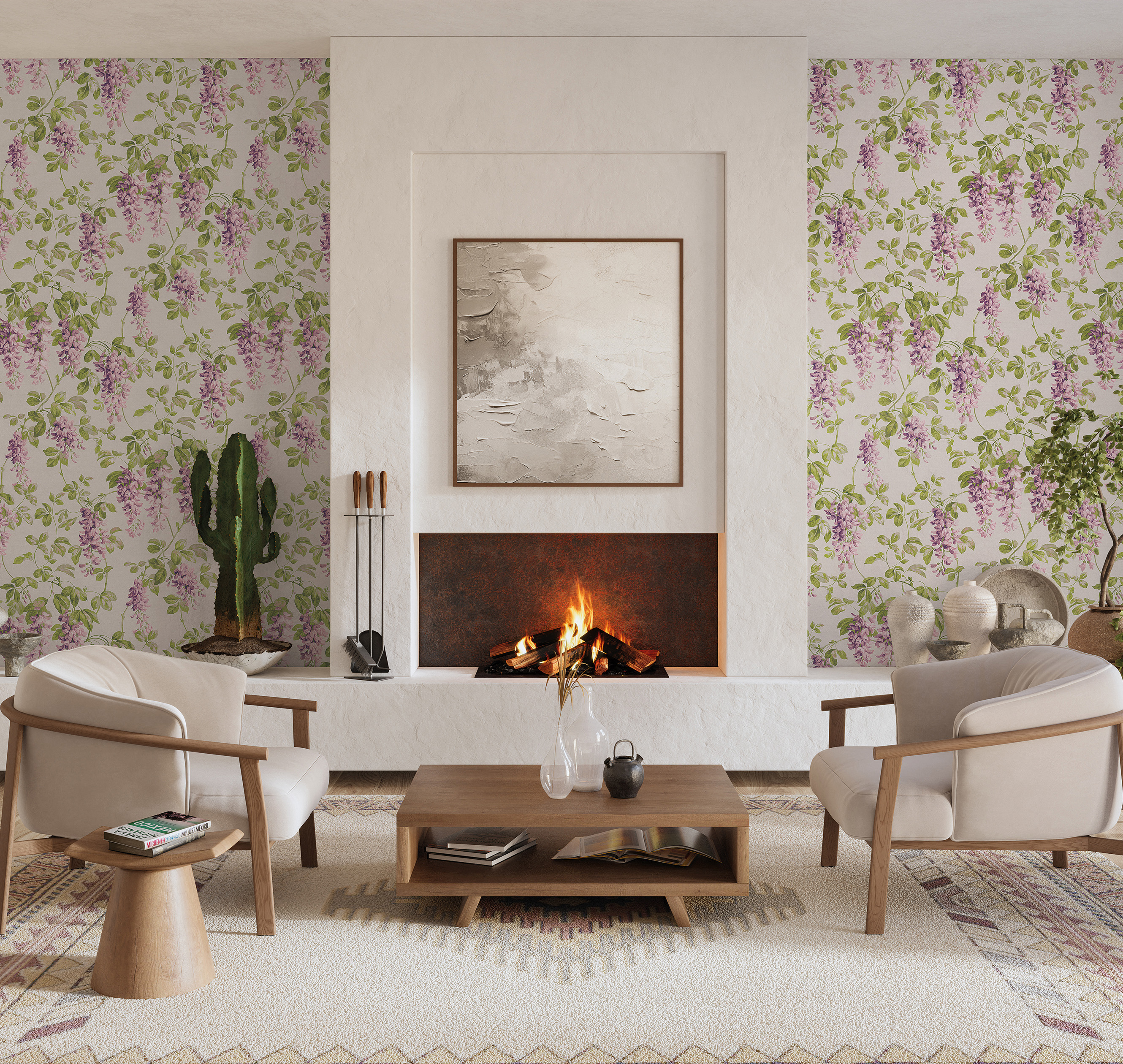 Основу палитры составляют натуральные оттенки зелени, дополненные нежными сиреневыми, фиолетовыми и пурпурными акцентами глициний. Такое сочетание создает ощущение свежести и спокойствия, словно вы находитесь в тихом уголке природы, вдали от городской суеты.