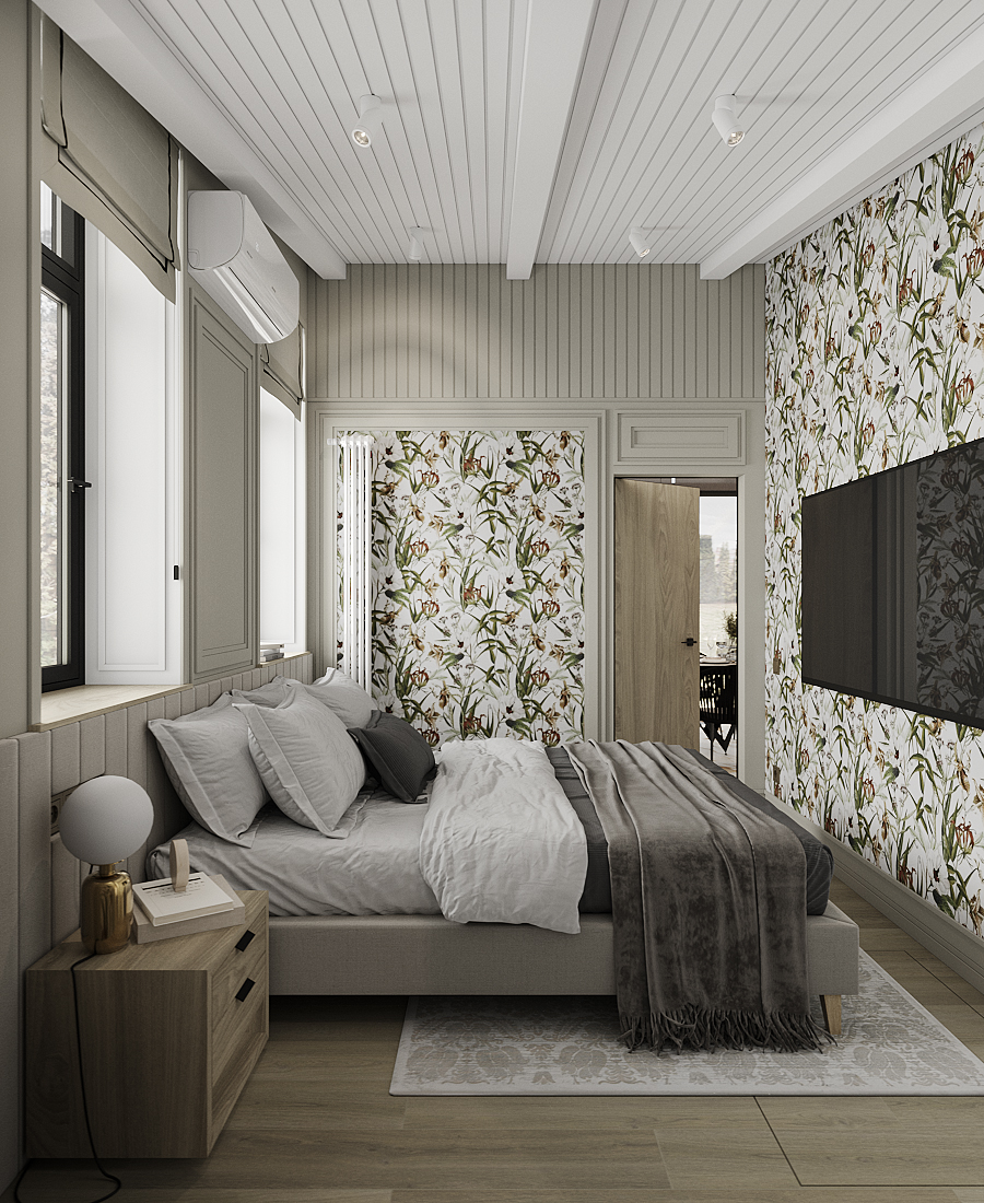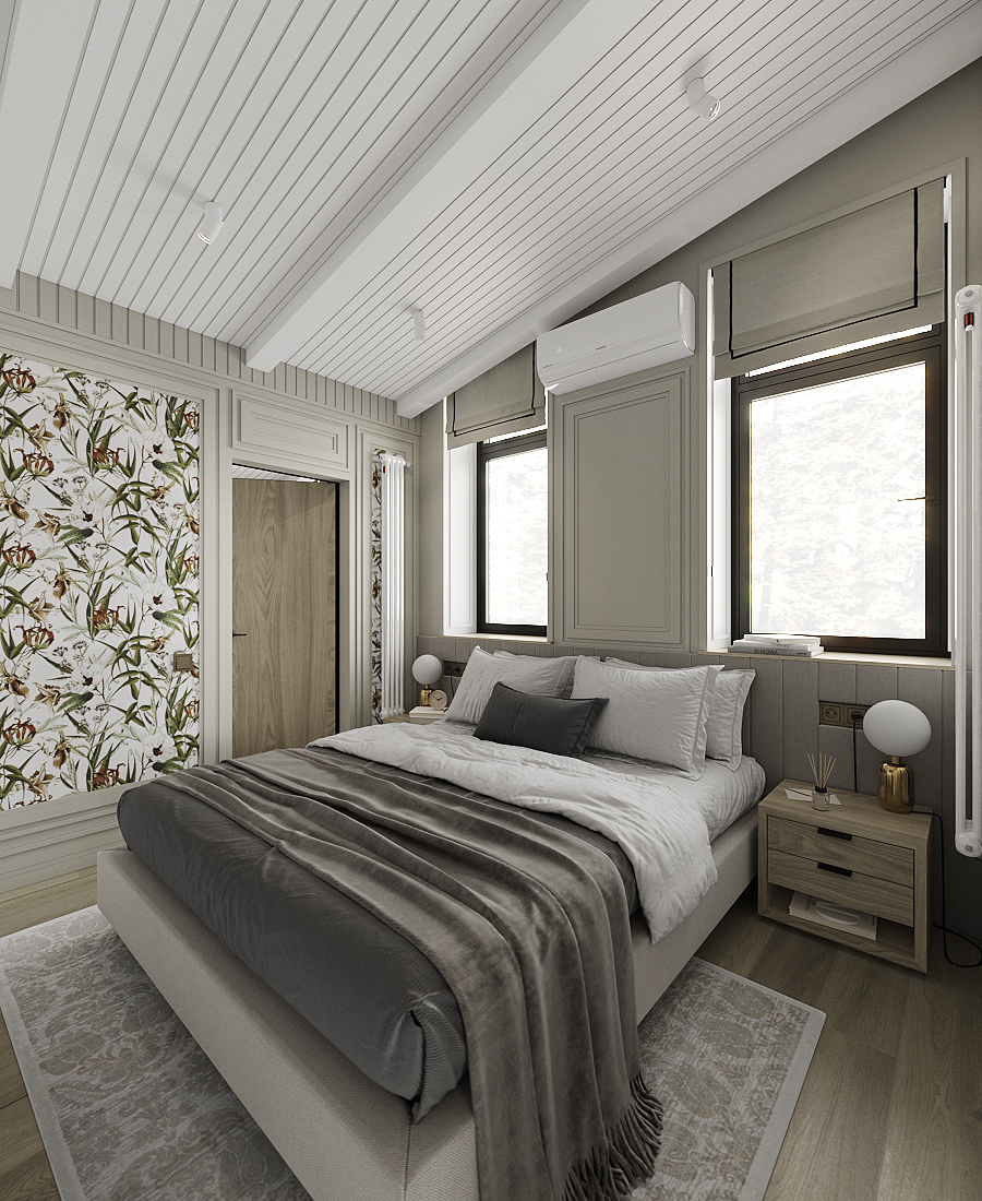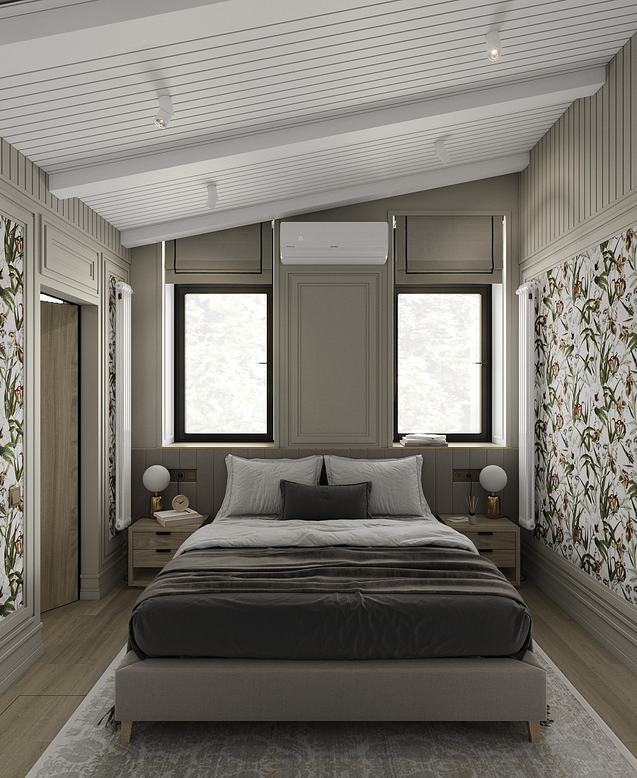 Устремяясь в мир снов и фантазий, спальня для гостей превращается в подлинное произведение искусства. Дизайн проект, проникнутый эстетическим вдохновением, создает ощущение, будто ты очнулся в магическом лесу. Пол выполнен из паркетной доски Coswick , приносит частичку сказочной природы в помещение. Лепнина на стенах от Orac Decor, создает гармонию и объем помещения. Стеновые панели от Orac Decor / W116, придают ощущение уюта и вносят нотки прованса. Обои Aura / Lost Island, словно таинственная пещера, их узоры и цвета переносят нас в мир садов и экзотических растений. Двери Unico Doors / Lume Beige. Светильники от Lightstar / Illumo F, освещают спальню мягким и теплым и направленным светом. Настольные лампы Arte Lamp / Bolla-Sola, наполняют каждый уголок комнаты теплотой и сиянием. Розетки и выключатели от Schneider Electric / Atlas Design в цвете «шампань». Радиатор от Arbonia, окрашенный в белый придает особую изящность общей палитре помещения.