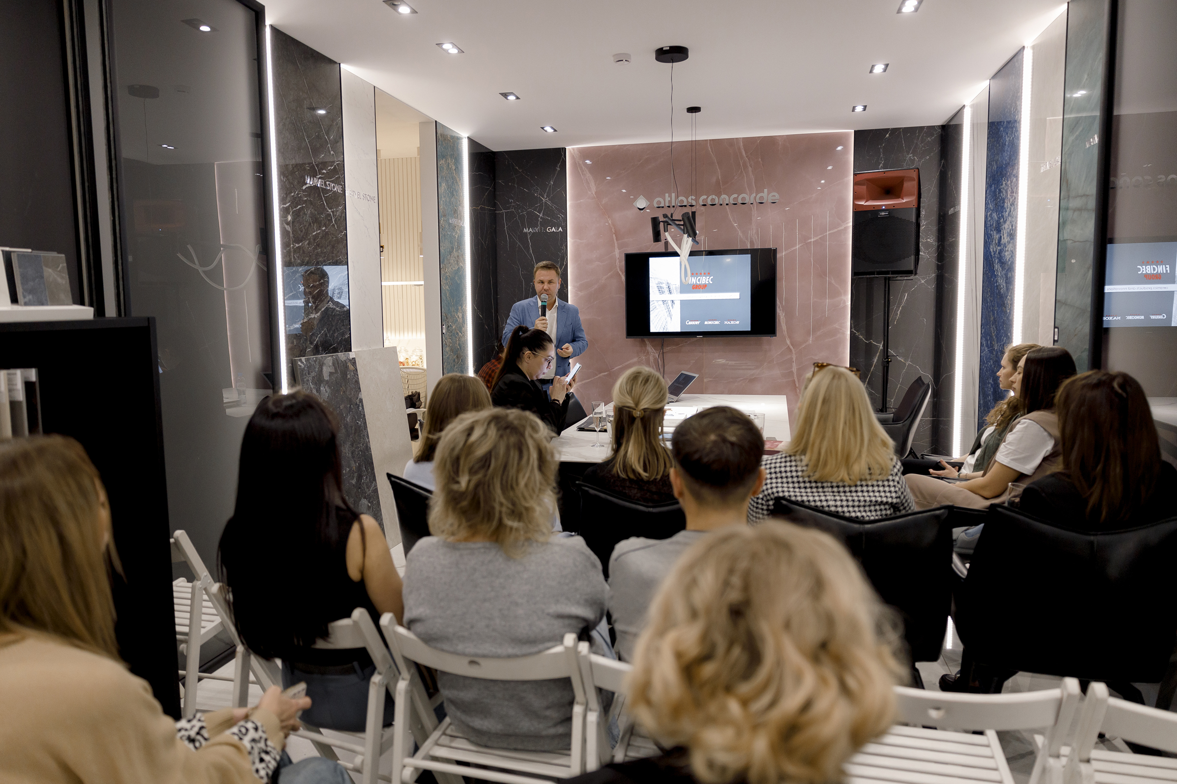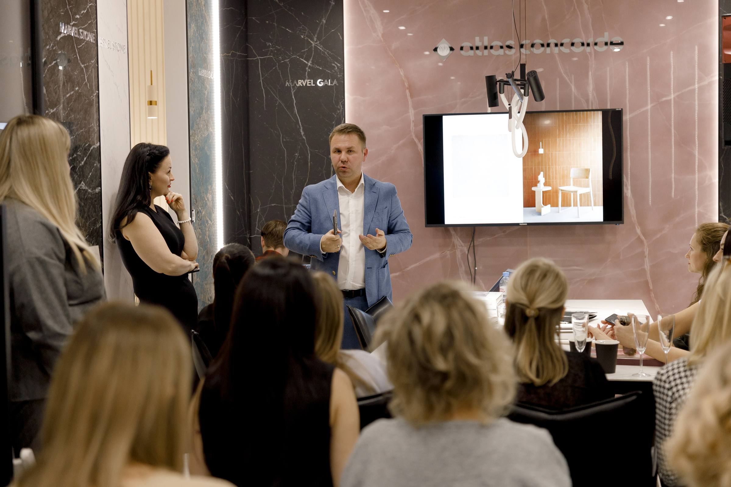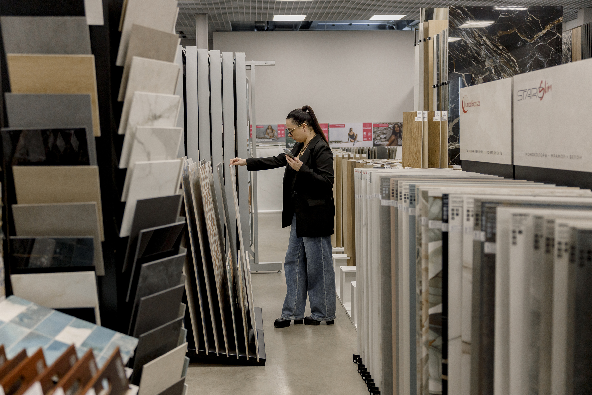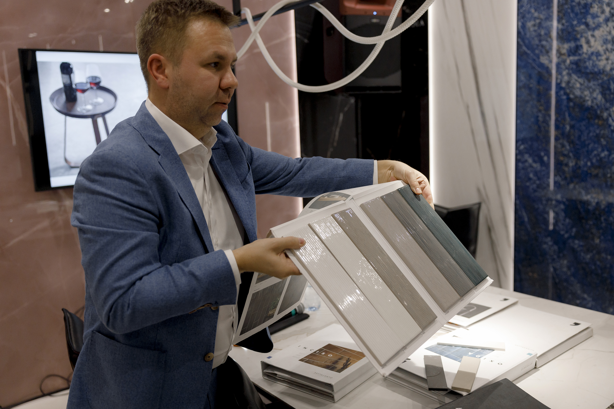 — Презентовали новые коллекции плитки, настоящие тактильные шедевры! Технологии шагнули далеко вперёд, и теперь плитка — это настоящее произведение искусства, которое можно и нужно трогать.