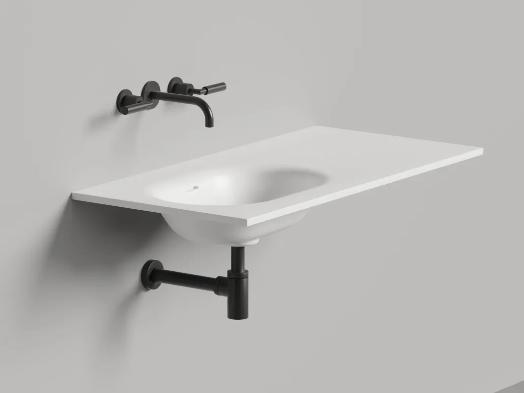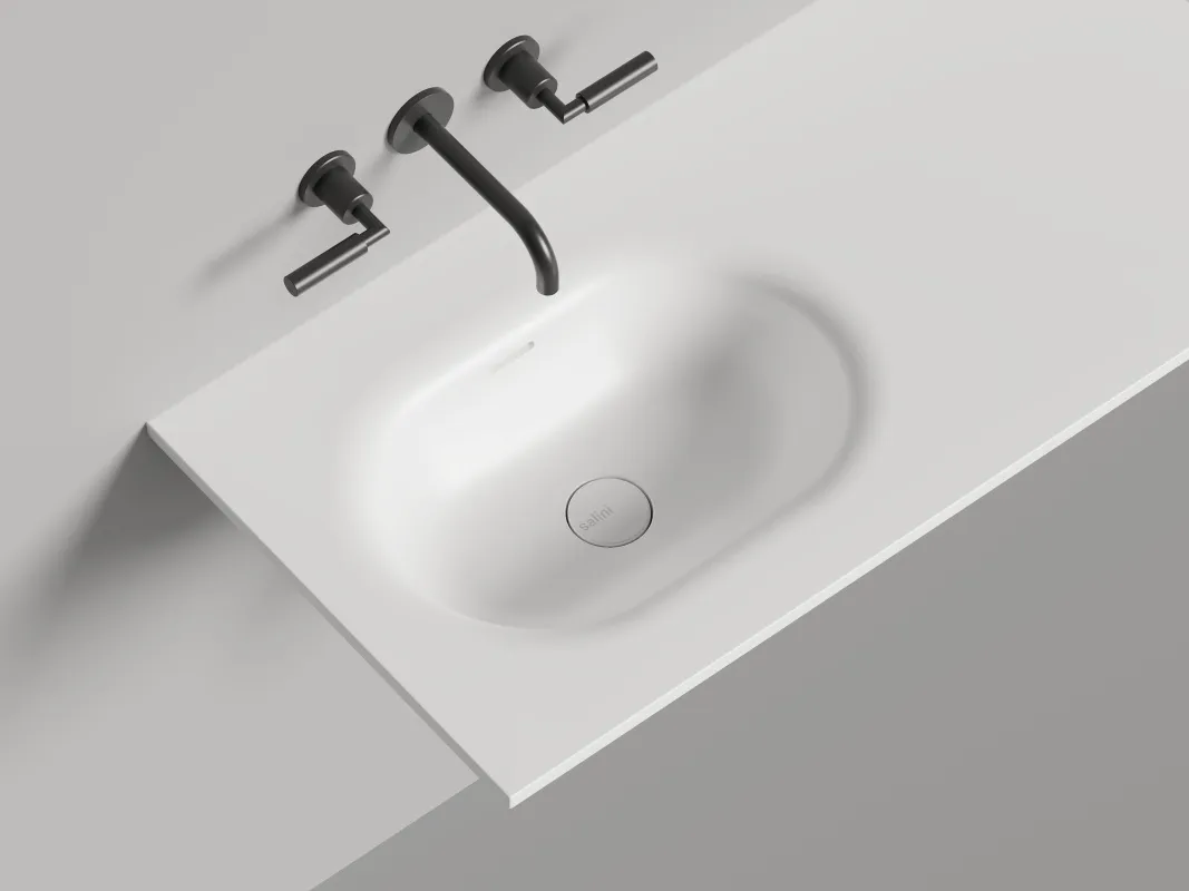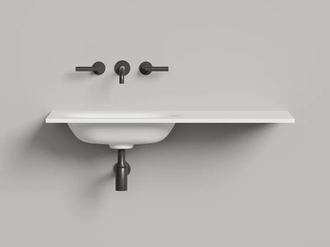 Раковина без отверстия под смеситель, донный клапан. Раковина БЕЗ отверстия* под смеситель, донный клапан. ONDA FLOW - индивидуальный размер раковины- столешницы ограниченный только геометрией чаши. В том числе возможно изготовление вариантов с левым / правым крылом для установки над стиральной машиной. |