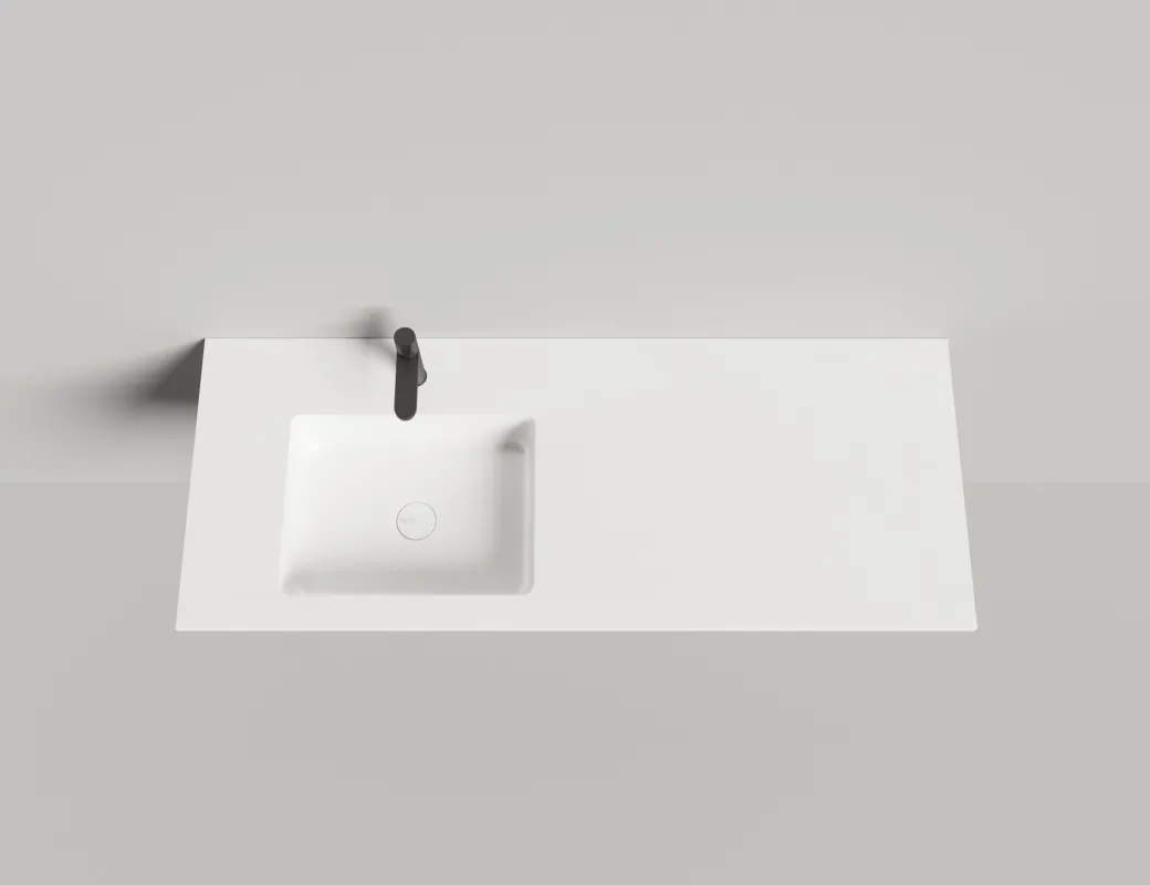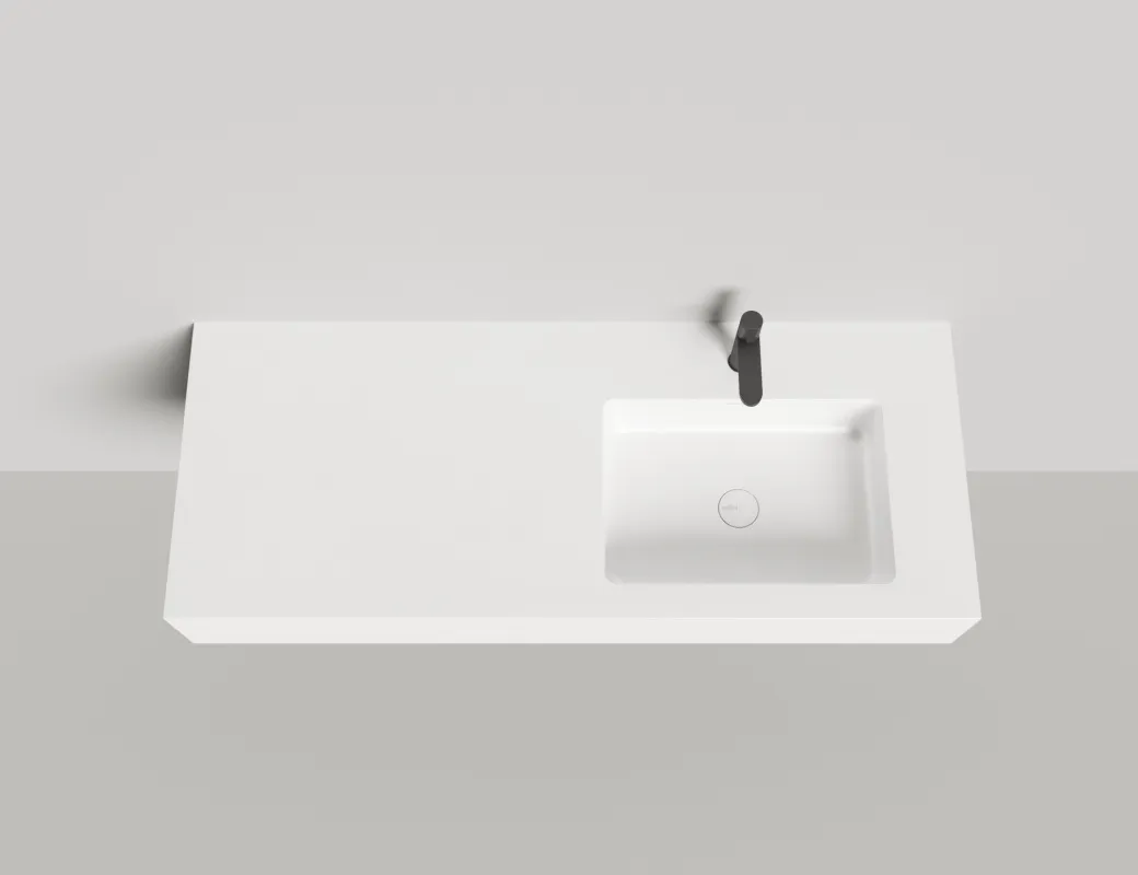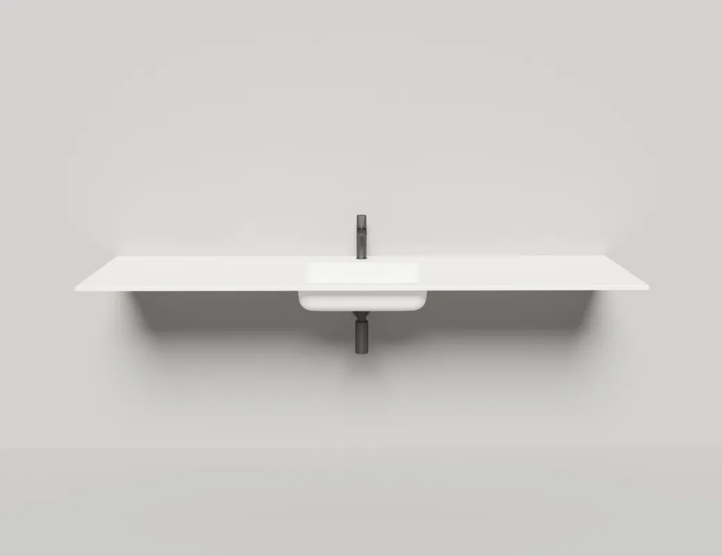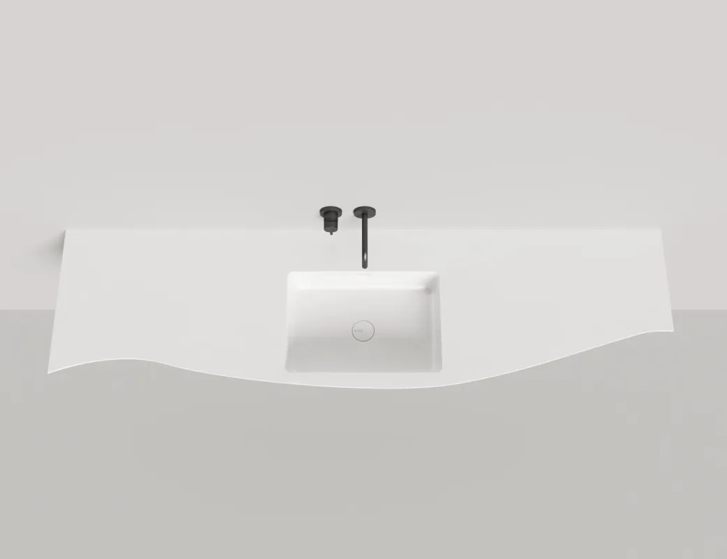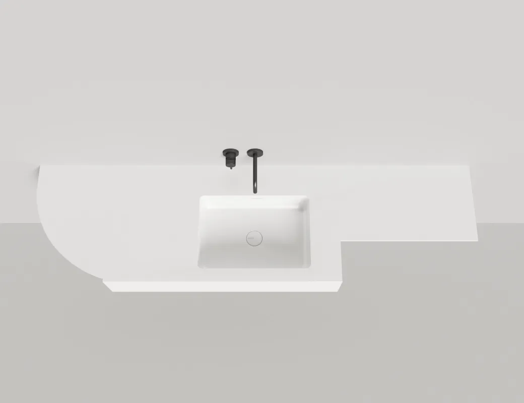 Раковина БЕЗ отверстия* под смеситель, донный клапан. ONDA PLUS - индивидуальный размер раковины- столешницы ограниченный только геометрией чаши. В том числе возможно изготовление вариантов с левым / правым крылом для установки над стиральной машиной. Возможно изготовление с фартуком |
