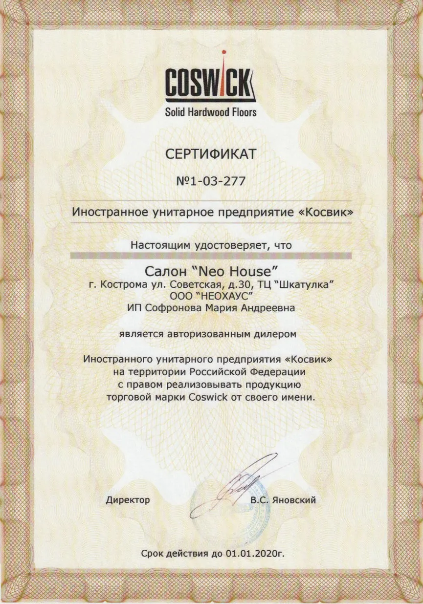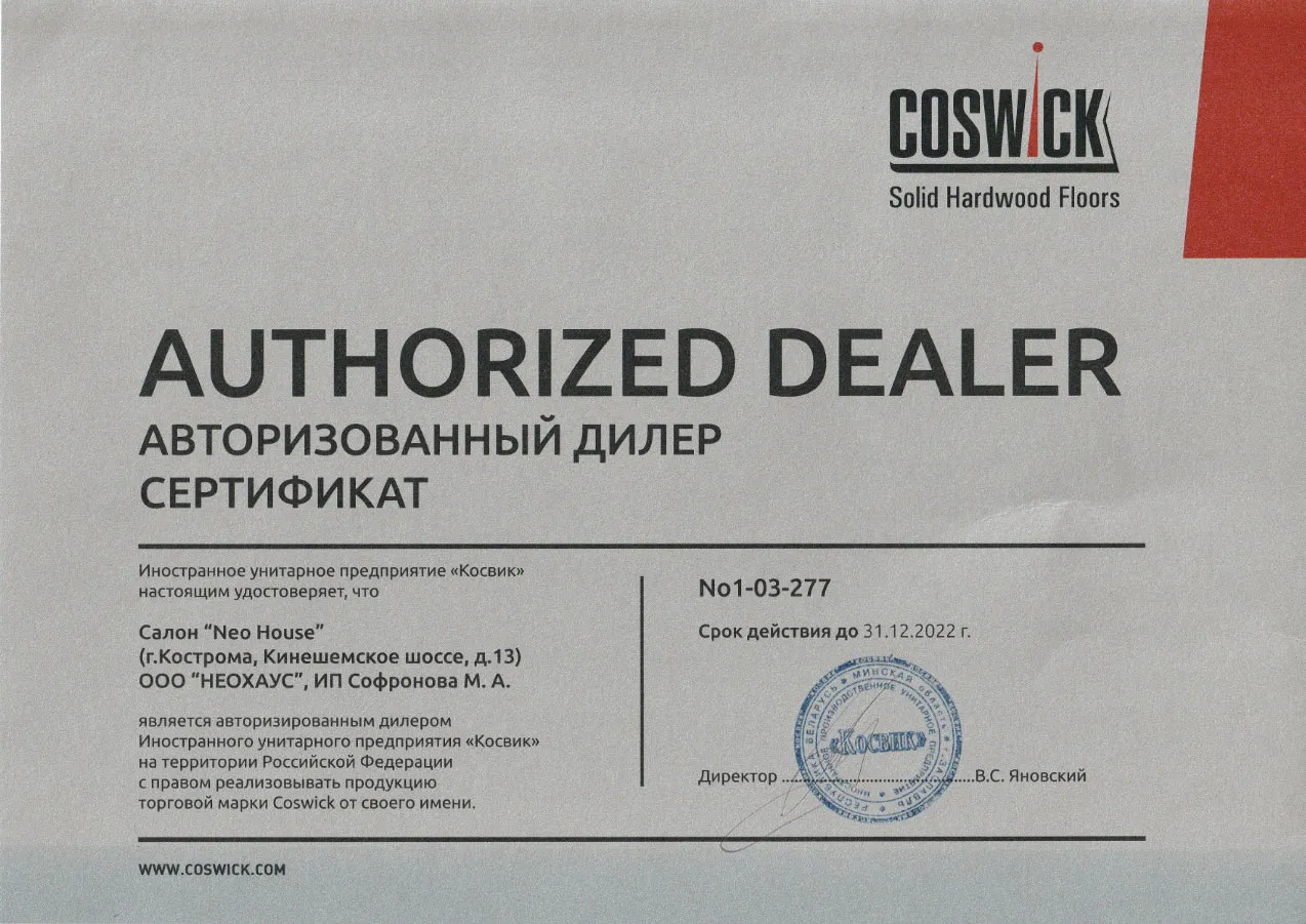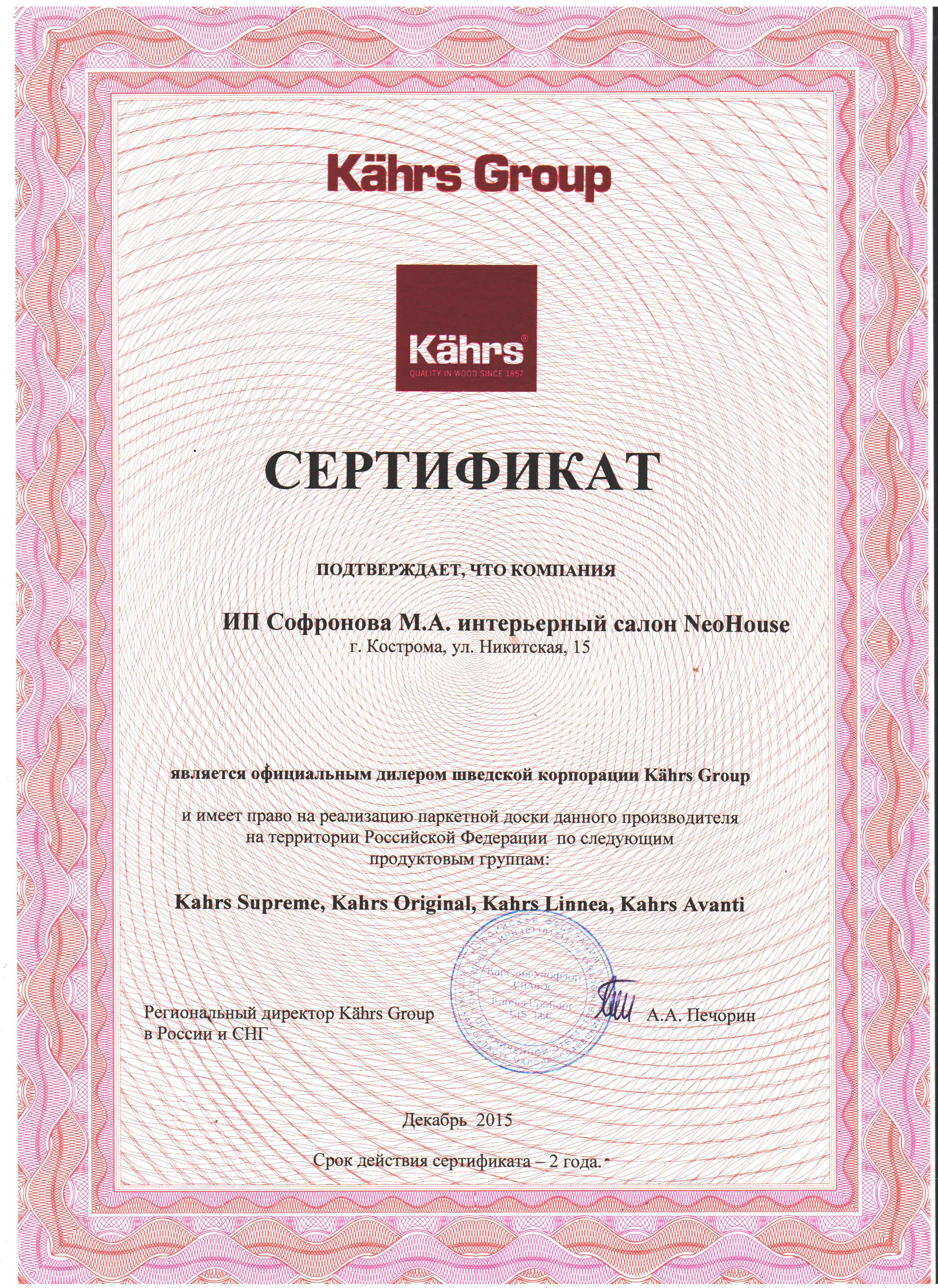 Сертификат подтверждает, что компания "NeoHouse" является официальным дилером шведской корпорации Kährs Group и имеет право на реализацию паркетной доски данного производителя на территории РФ по следующим продуктовым группам: Kährs Supreme, Kährs Original, Kährs Linnea и Kährs Avanti