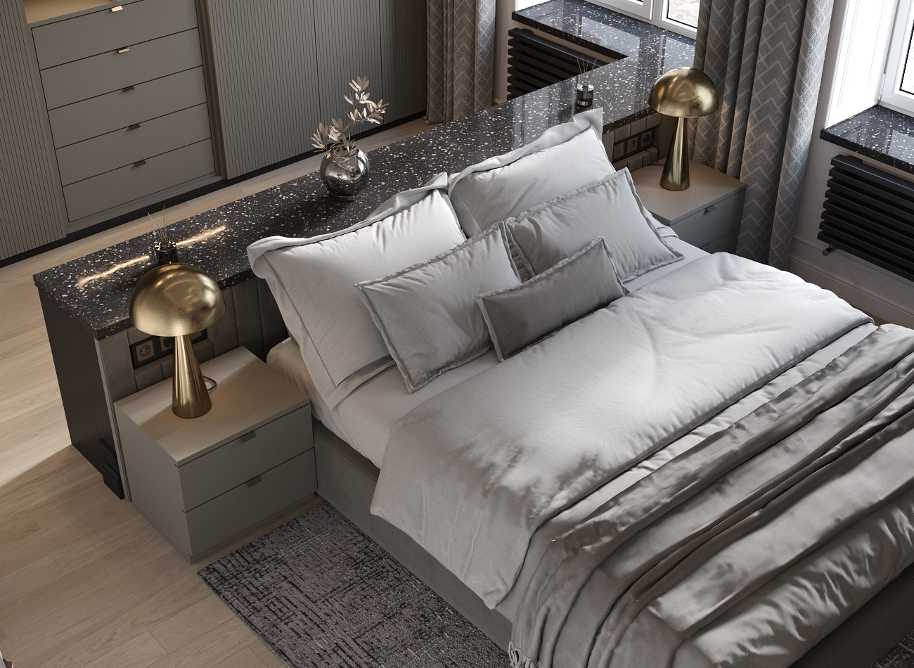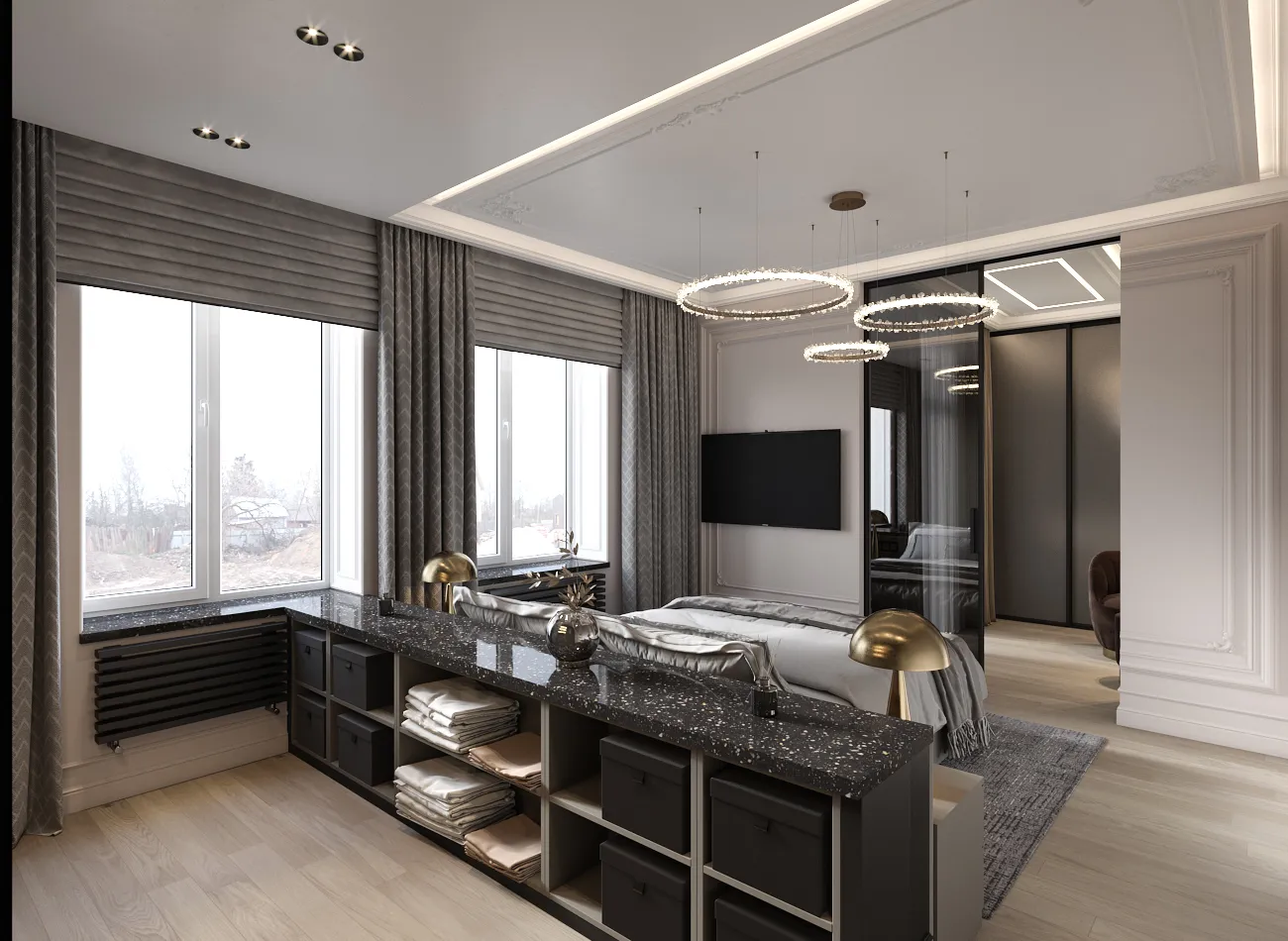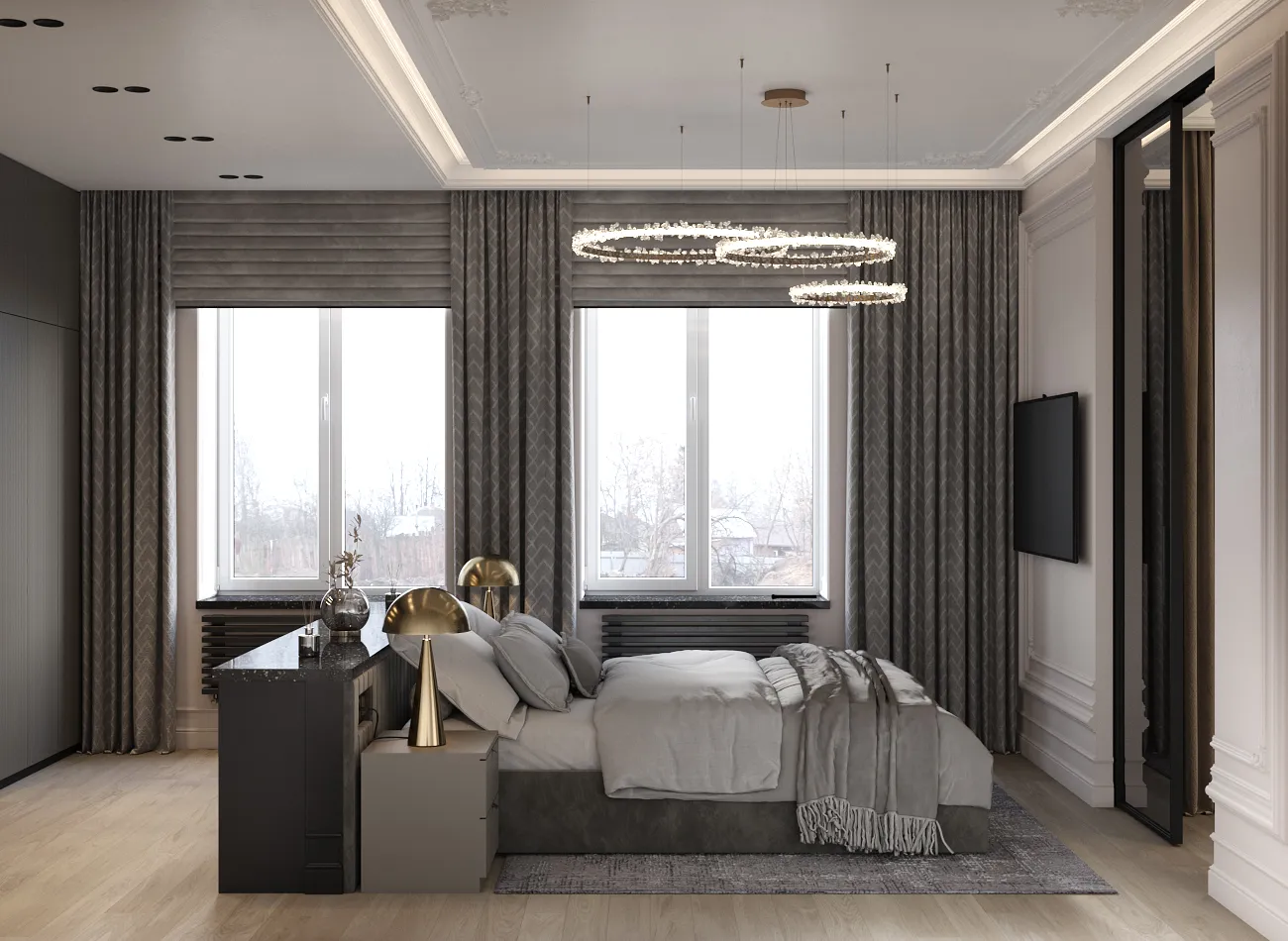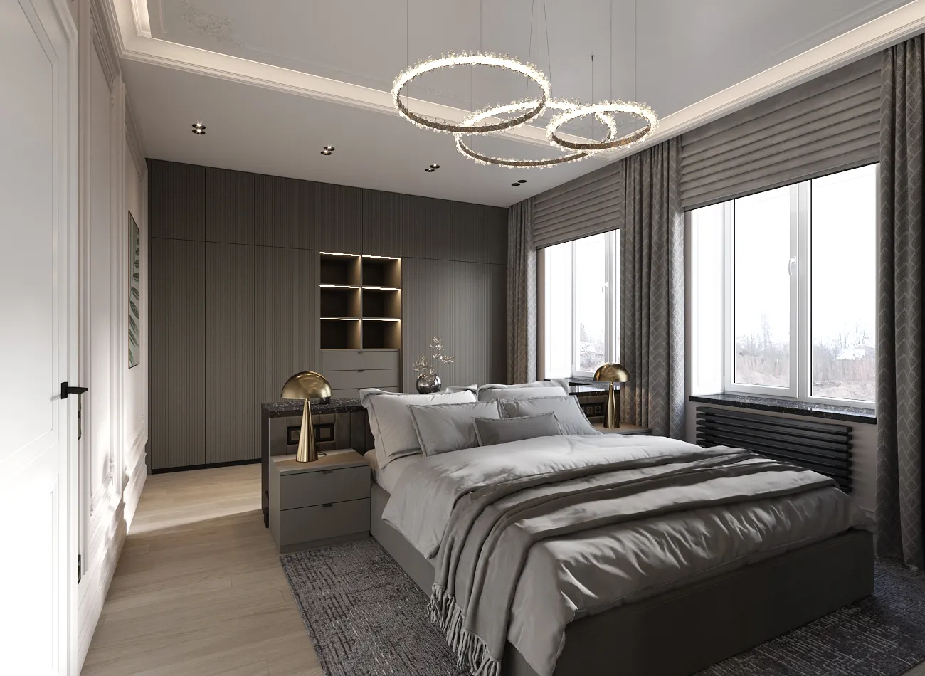 Интерьер спальни выполнен в стиле современной классики, сочетая элегантность и функциональность. Центром комнаты является кровать с мягким изголовьем, симметрично окруженная тумбочками со светильниками. Большие окна наполняют пространство светом.