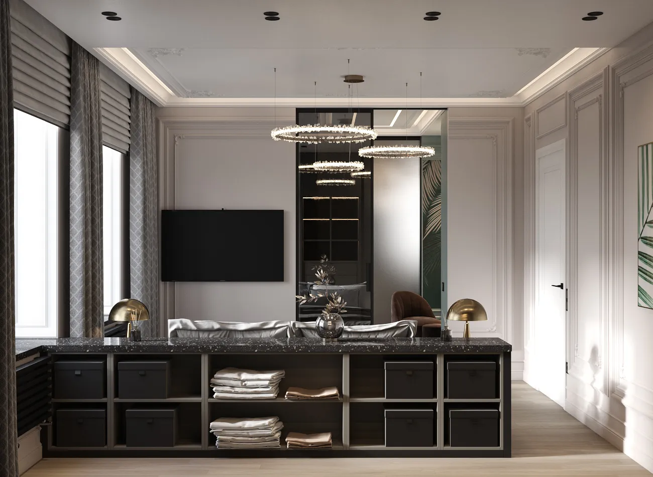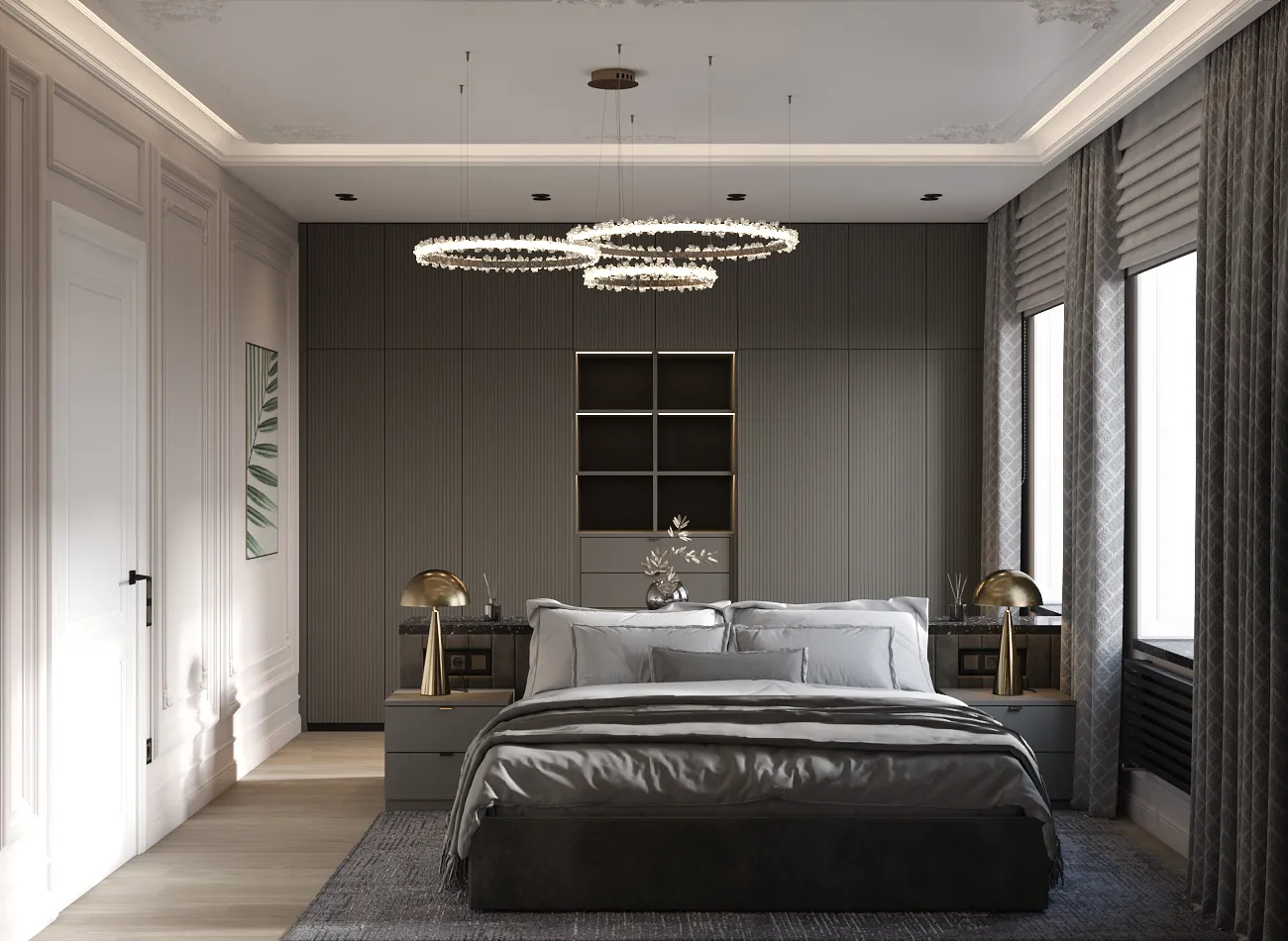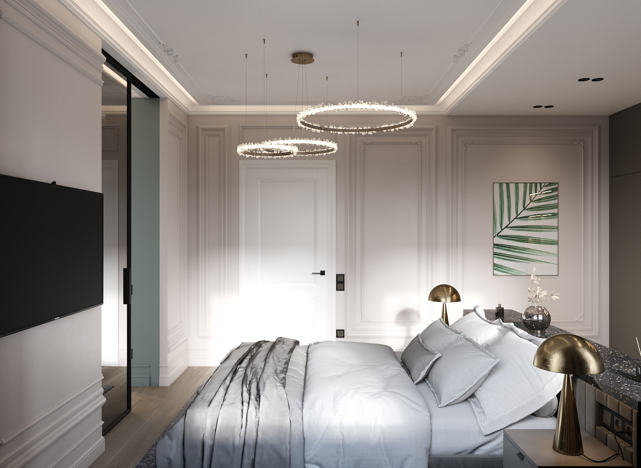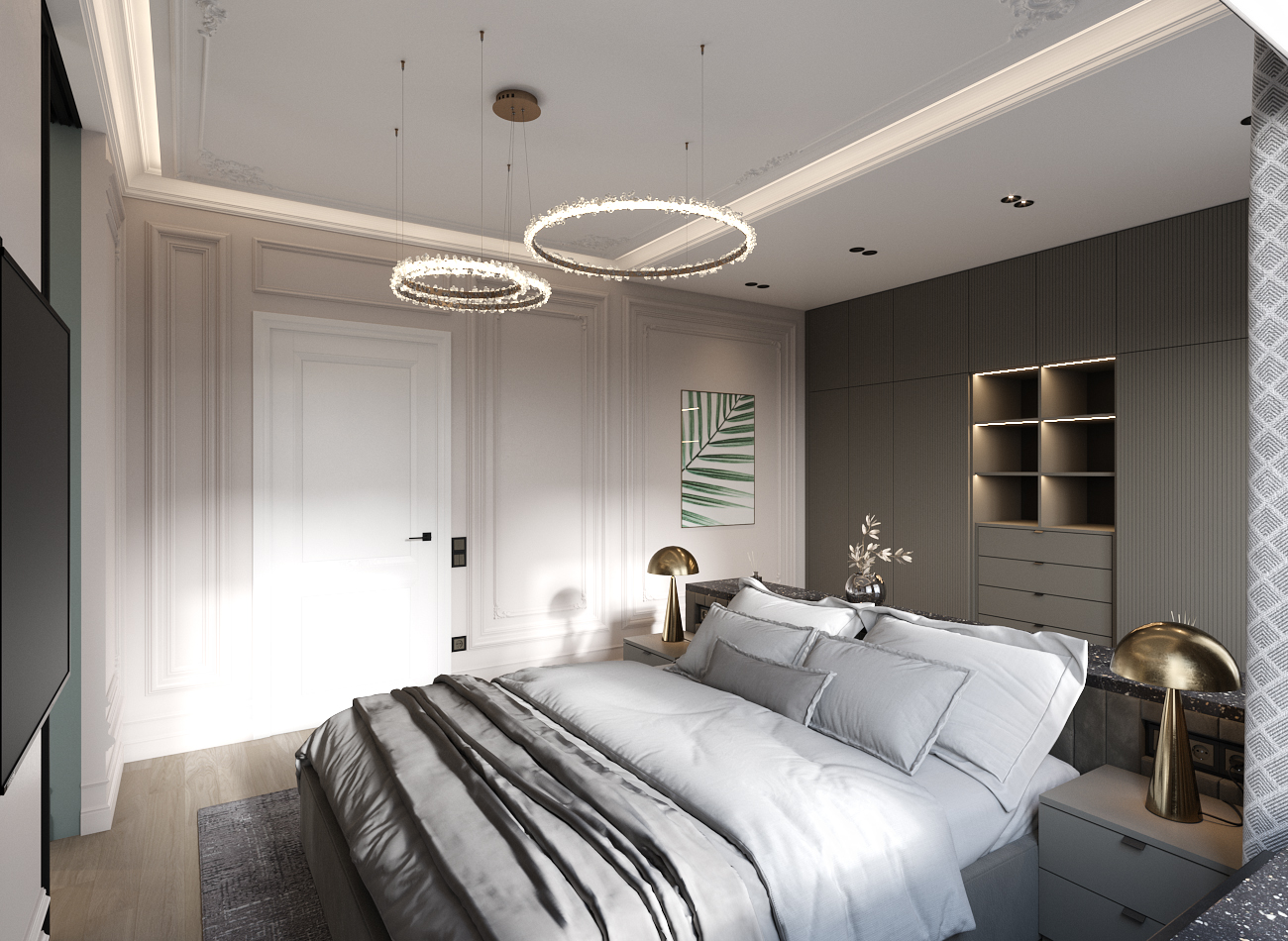 Отделку дополняют рельефные молдинги, теплый бежевый цвет стен и паркет. Многоуровневое освещение включает роскошную хрустальную люстру, скрытую подсветку и точечные светильники. Интерьер создает гармоничное пространство для отдыха.
