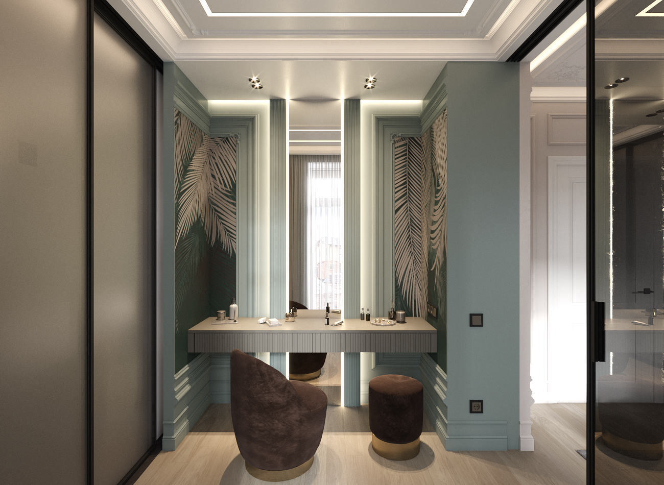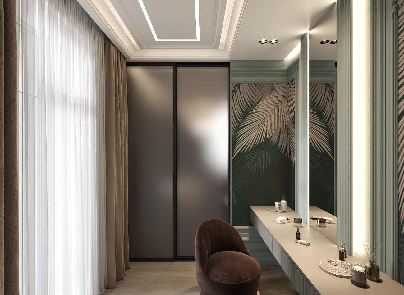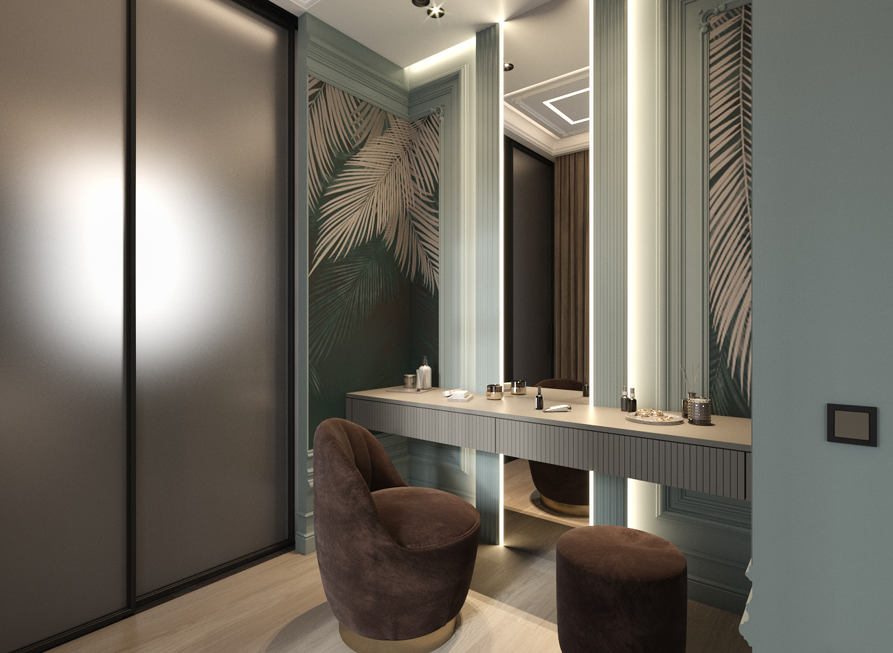 Система хранения элегантно интегрирована в виде высокого шкафа с филенчатыми фасадами. Особую изюминку добавляет приватная будуарная зона оливкового цвета с фресками с тропическими пальмами и туалетным столиком, за которой скрыт вход в ванную.
