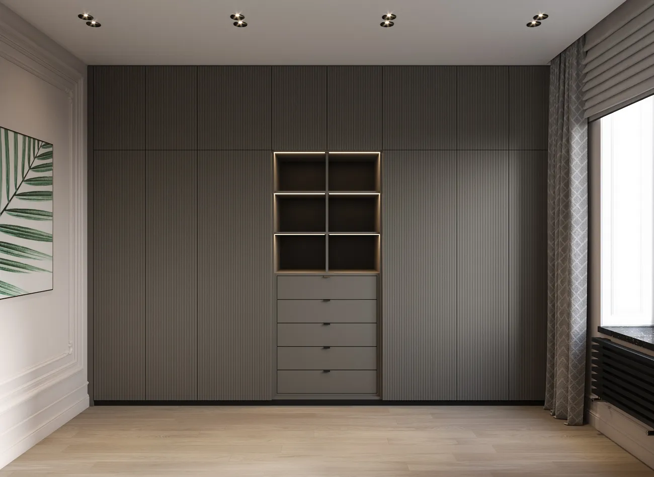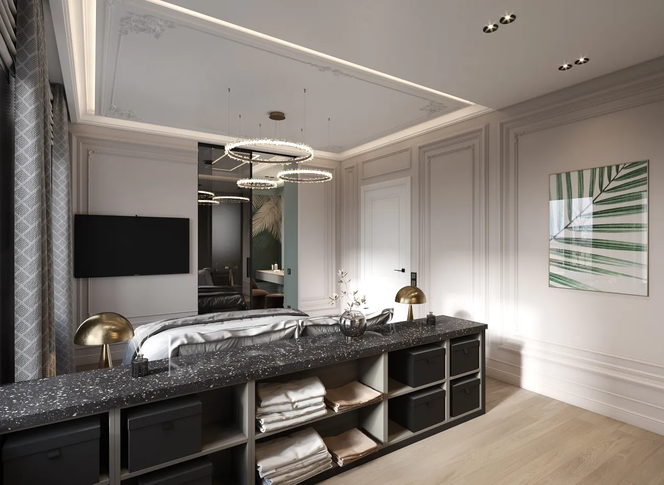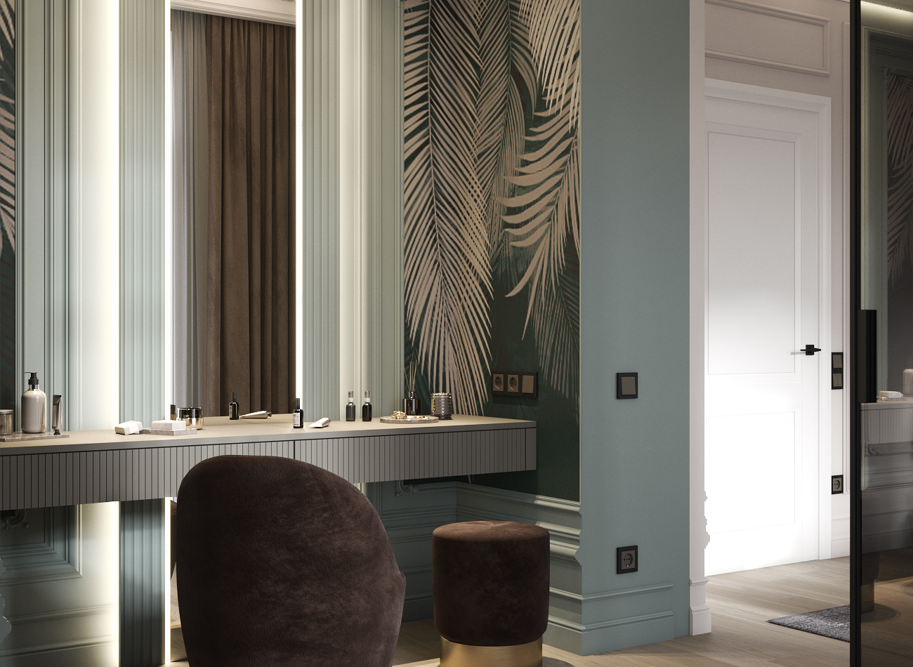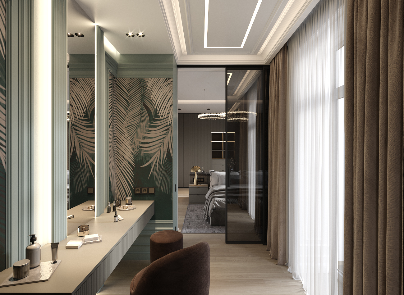 Система хранения элегантно интегрирована в виде высокого шкафа с филенчатыми фасадами. Особую изюминку добавляет приватная будуарная зона оливкового цвета с фресками с тропическими пальмами и туалетным столиком, за которой скрыт вход в ванную.