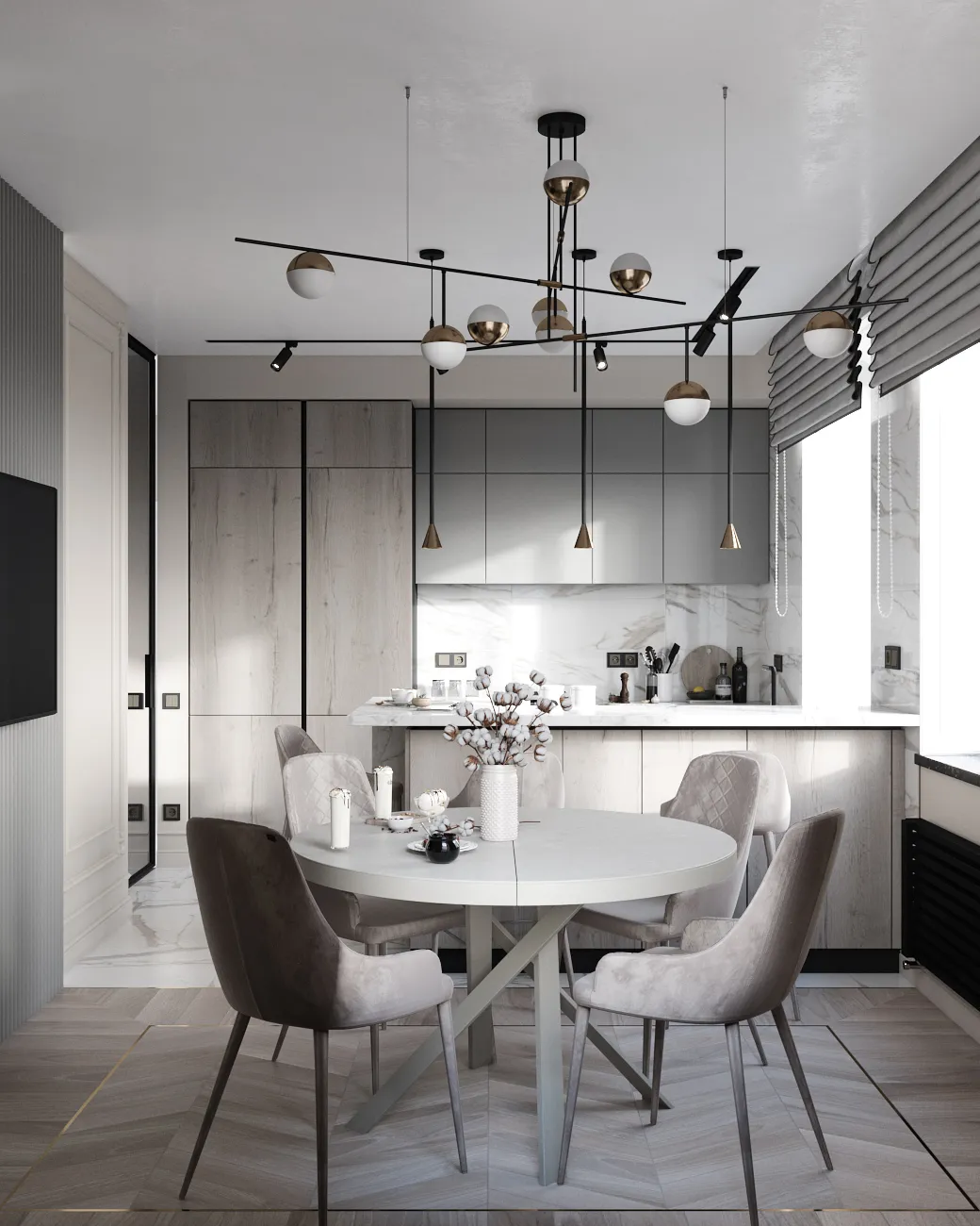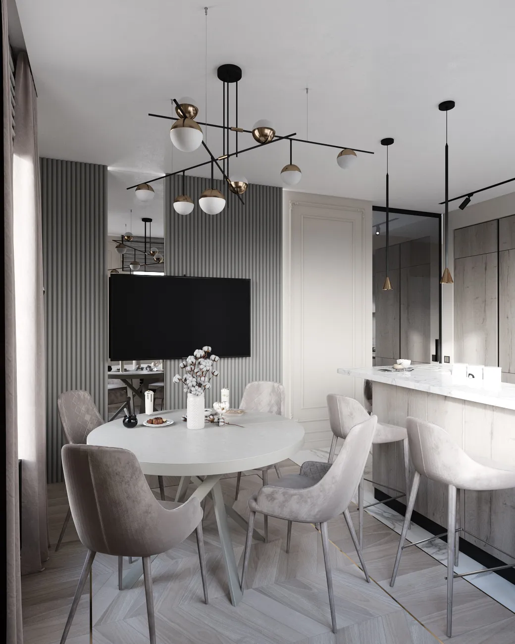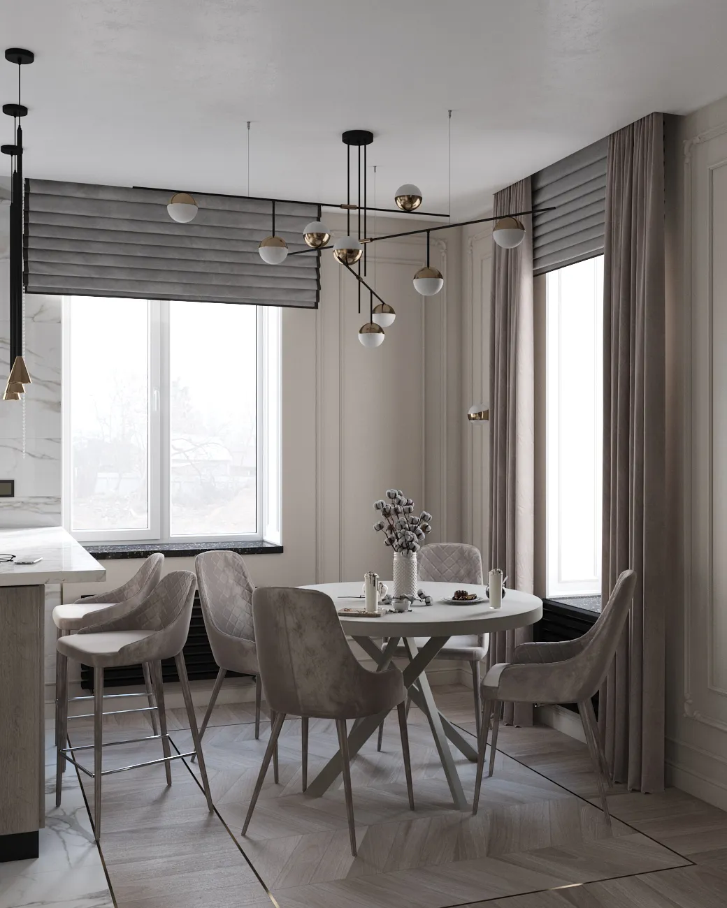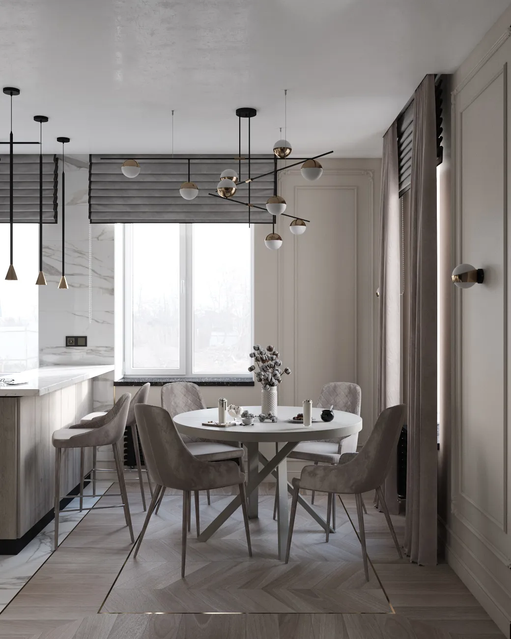 Интерьер кухни-столовой выполнен в эстетике современной классики с элегантным сочетанием серых и белых тонов. Пространство разделено на обеденную зону с паркетной плиткой "французская елка" и практичную рабочую область с мраморным фартуком.