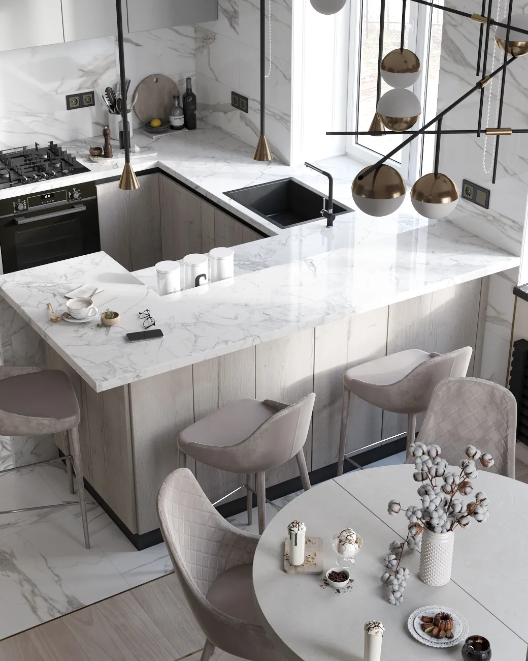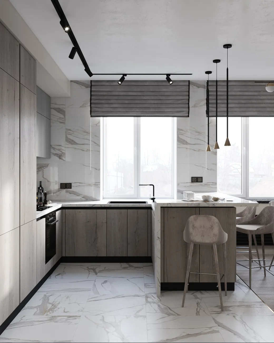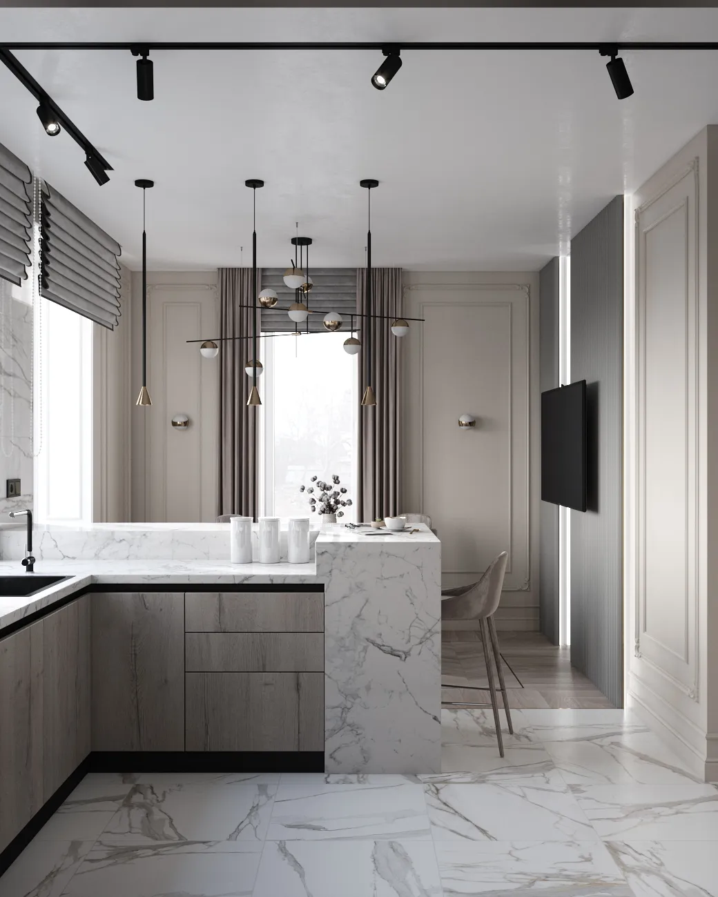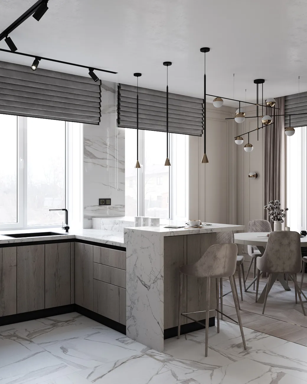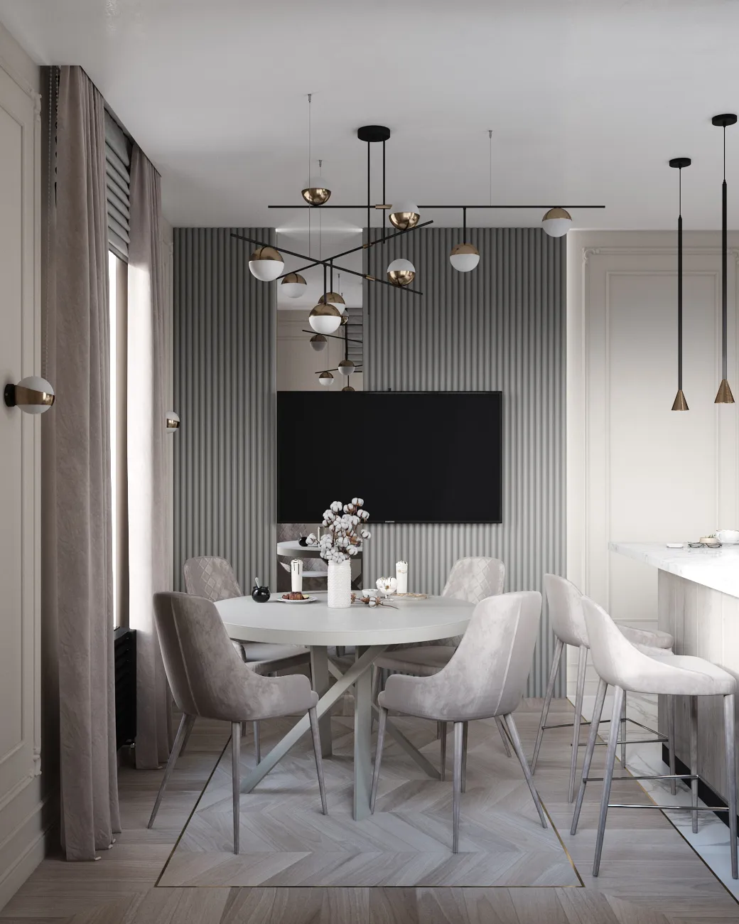 Интерьер кухни-столовой выполнен в эстетике современной классики с элегантным сочетанием серых и белых тонов. Пространство разделено на обеденную зону с паркетной плиткой "французская елка" и практичную рабочую область с мраморным фартуком.