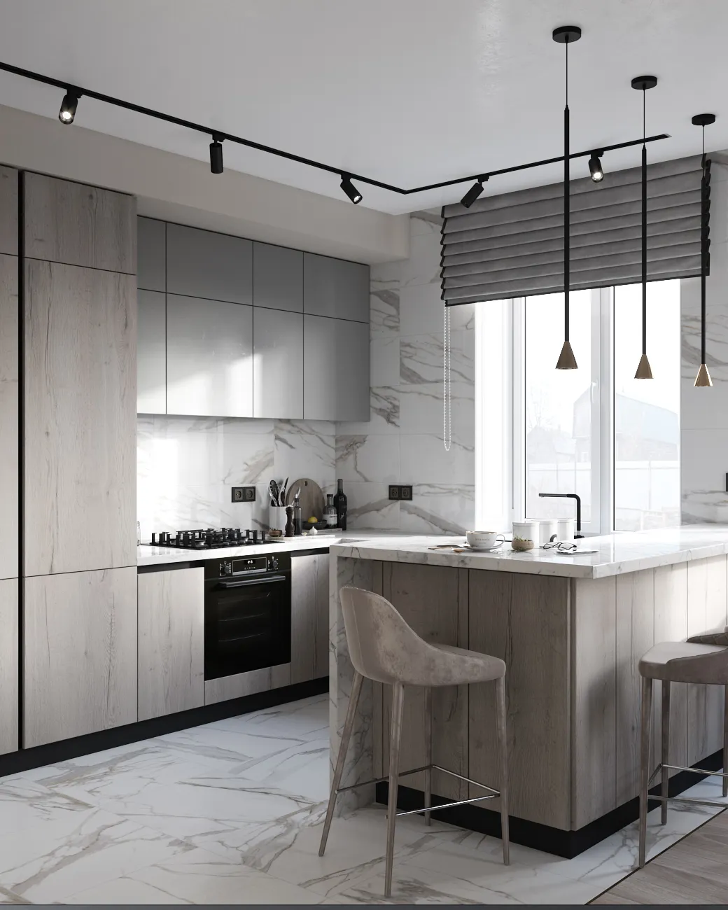 Элегантный серый гарнитур с белой столешницей гармонирует с бежевыми стенами и белым потолком, создавая сбалансированное и уютное пространство, где каждая деталь демонстрирует безупречный вкус и функциональность.